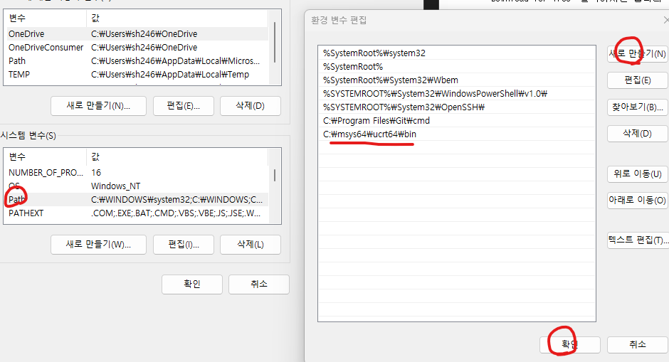 -> "새로만들기(N)" 클릭 -> C:\msys64\ucrt64\bin 적고 확인