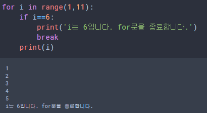 i가 6인 차례에 실행 코드를 실행하게 되면 if조건문에 해당되어 작성해둔 print문이 출력되고 break를 만나 종료됩니다.