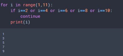 for문을 수행하다가 i가 짝수(2,4,6,8,10)이라면 if 조건문에 해당되어 continue가 실행됩니다.