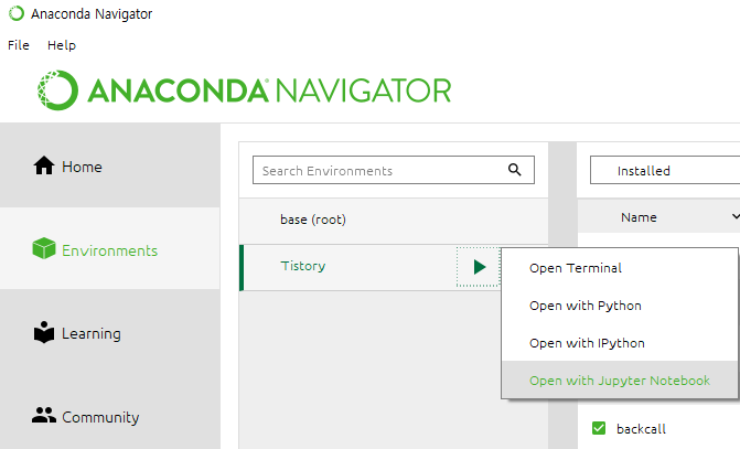 1. Anaconda Navigator -> Environment -> Tistory -> Open with Jupyter Notebook
